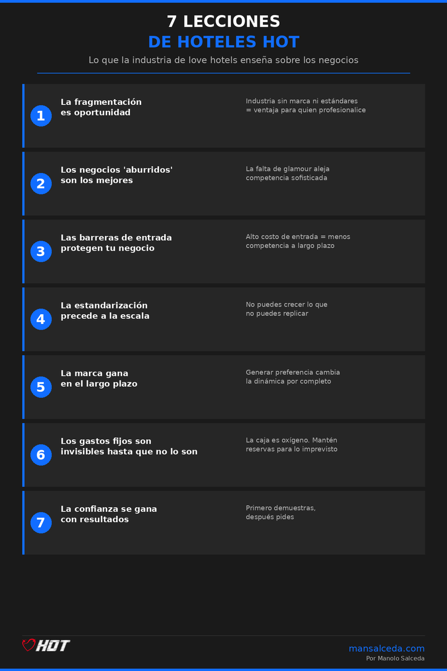Cuando una industria tiene miles de participantes y ninguno tiene marca, estándares o escala, el primer jugador que profesionalice la operación obtiene una ventaja desproporcionada. Esto aplica igual a love hotels que a lavanderías, estacionamientos o cualquier servicio fragmentado.